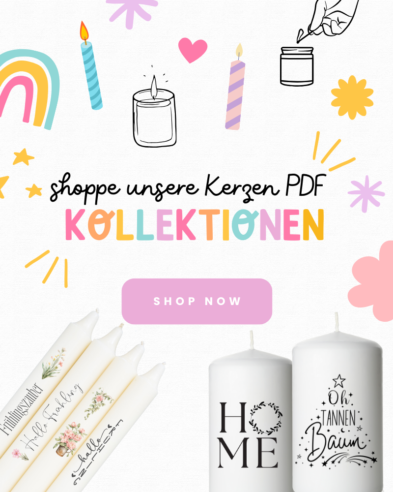 Unsere Vorlagen im Din A4 Format, lassen sich ganz einfach auf Wasserschiebefolie drucken. Gestalte dir deine Kerzen.